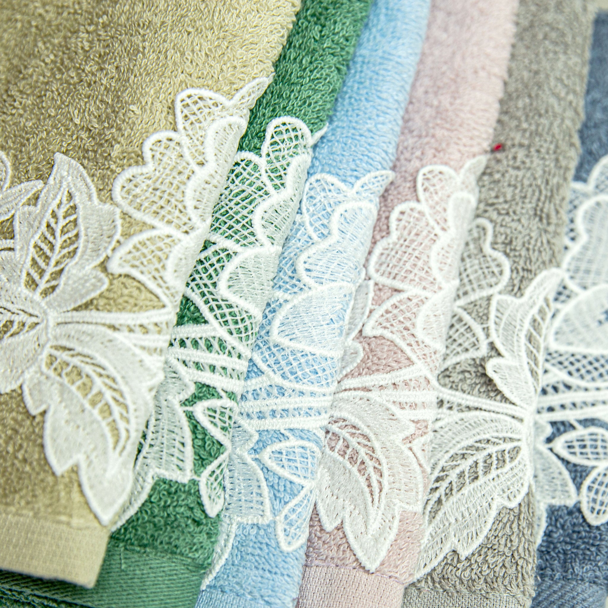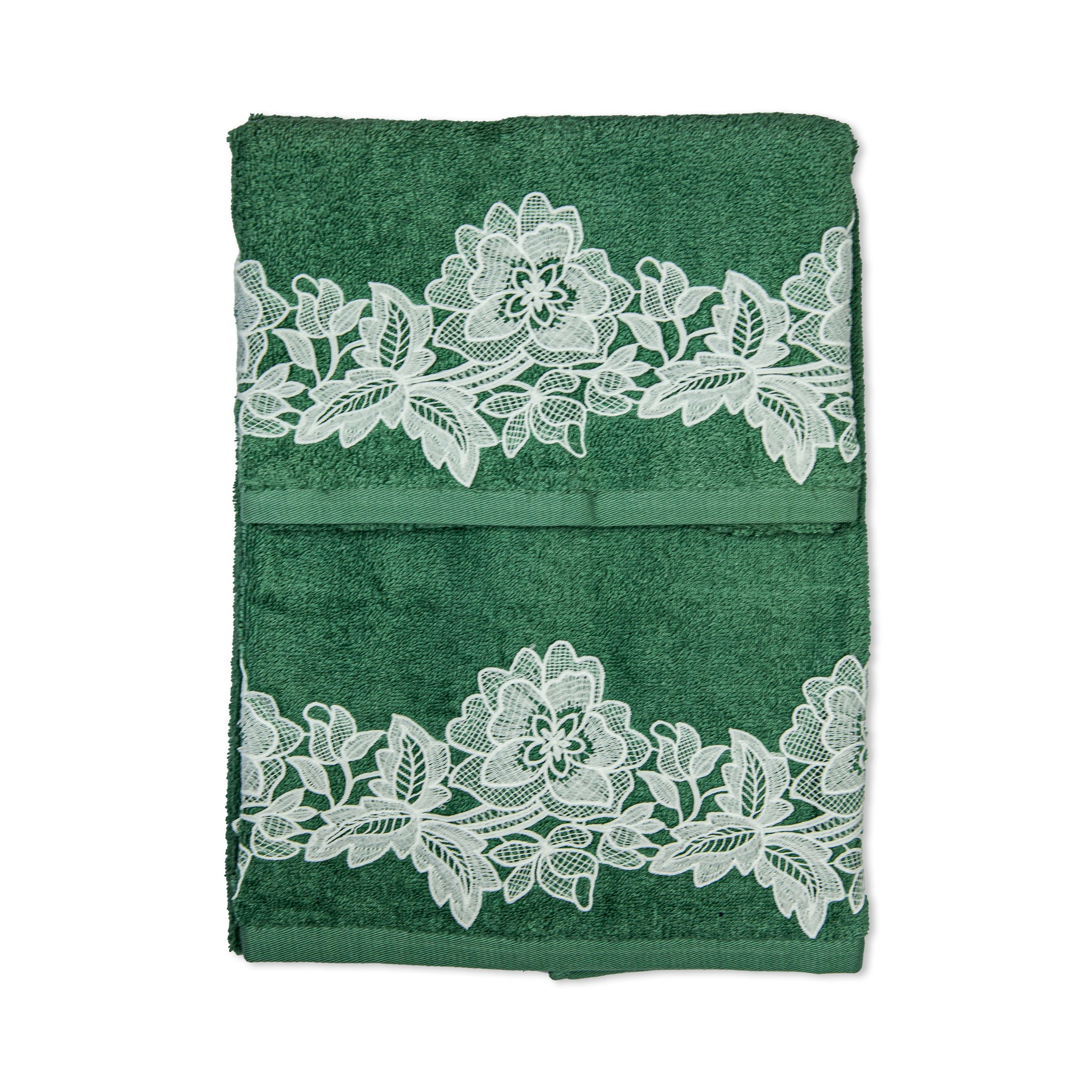La coppia di asciugamani è realizzata in spugna 100% COTONE, ha una fascia molto elegante in pizzo MACRAME' panna con motivo floreale