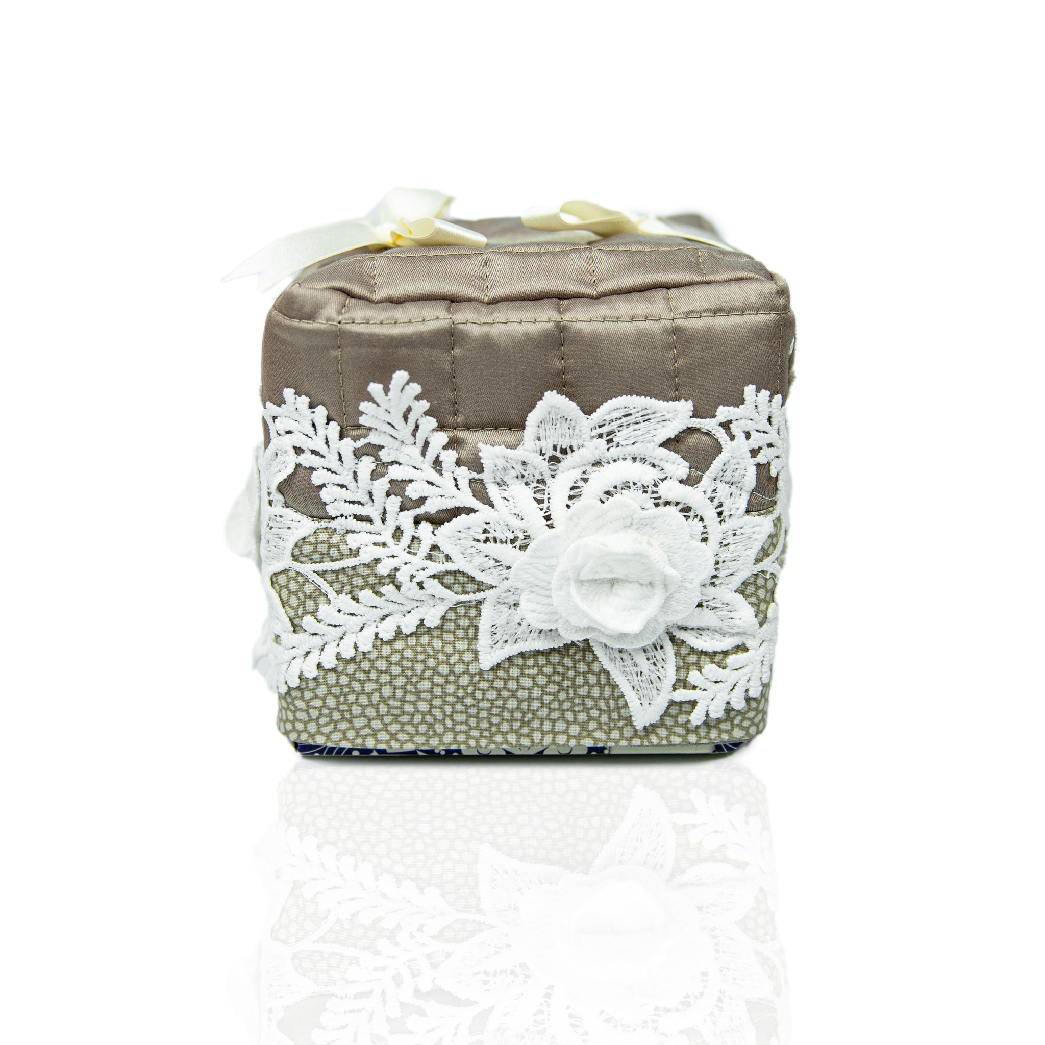 Il PORTAKEENEX della serie BOLLICINE è realizzato in raso trapuntato color TORTORA (in puro cotone) con balza in pizzo MACRAME' PANNA a motivo ROSE e una BALZA in fantasia beige a BOLLICINE