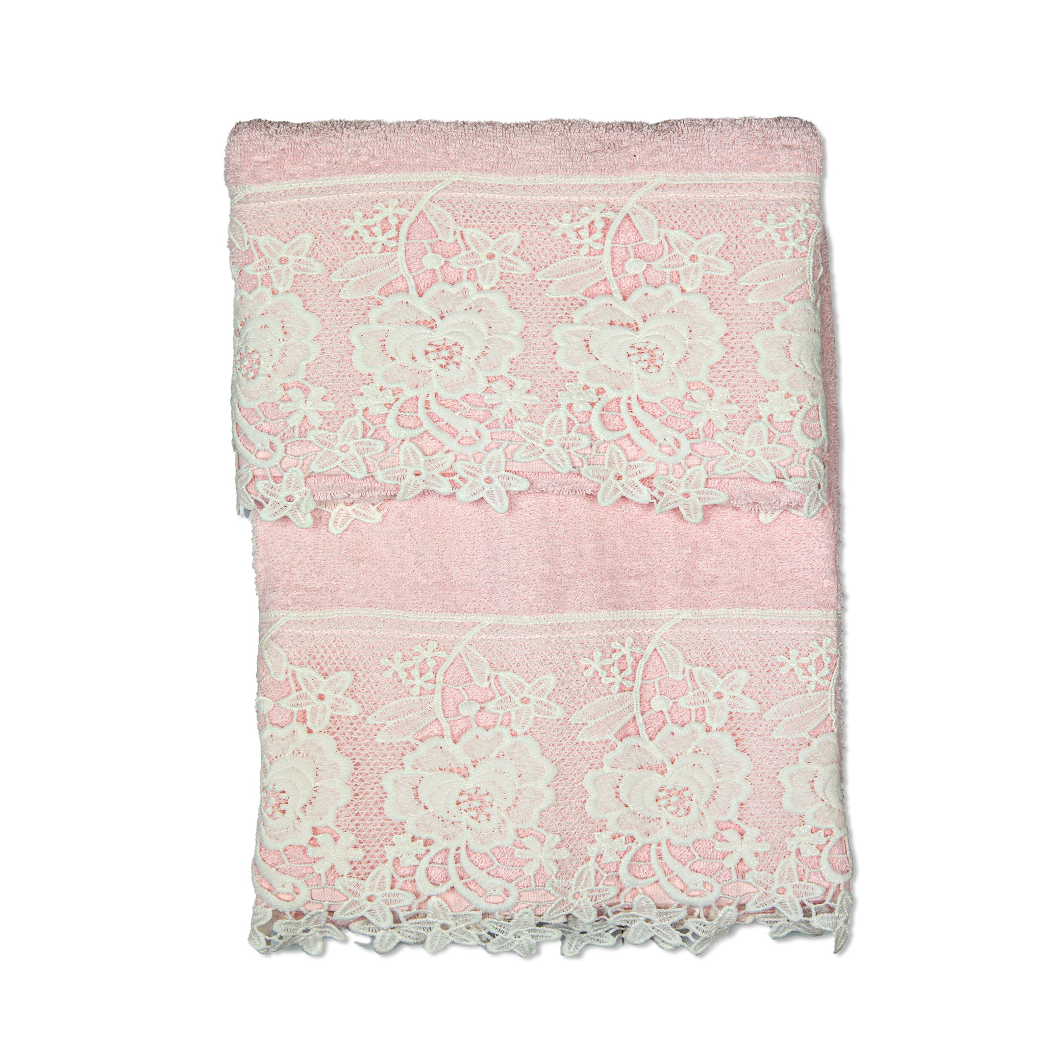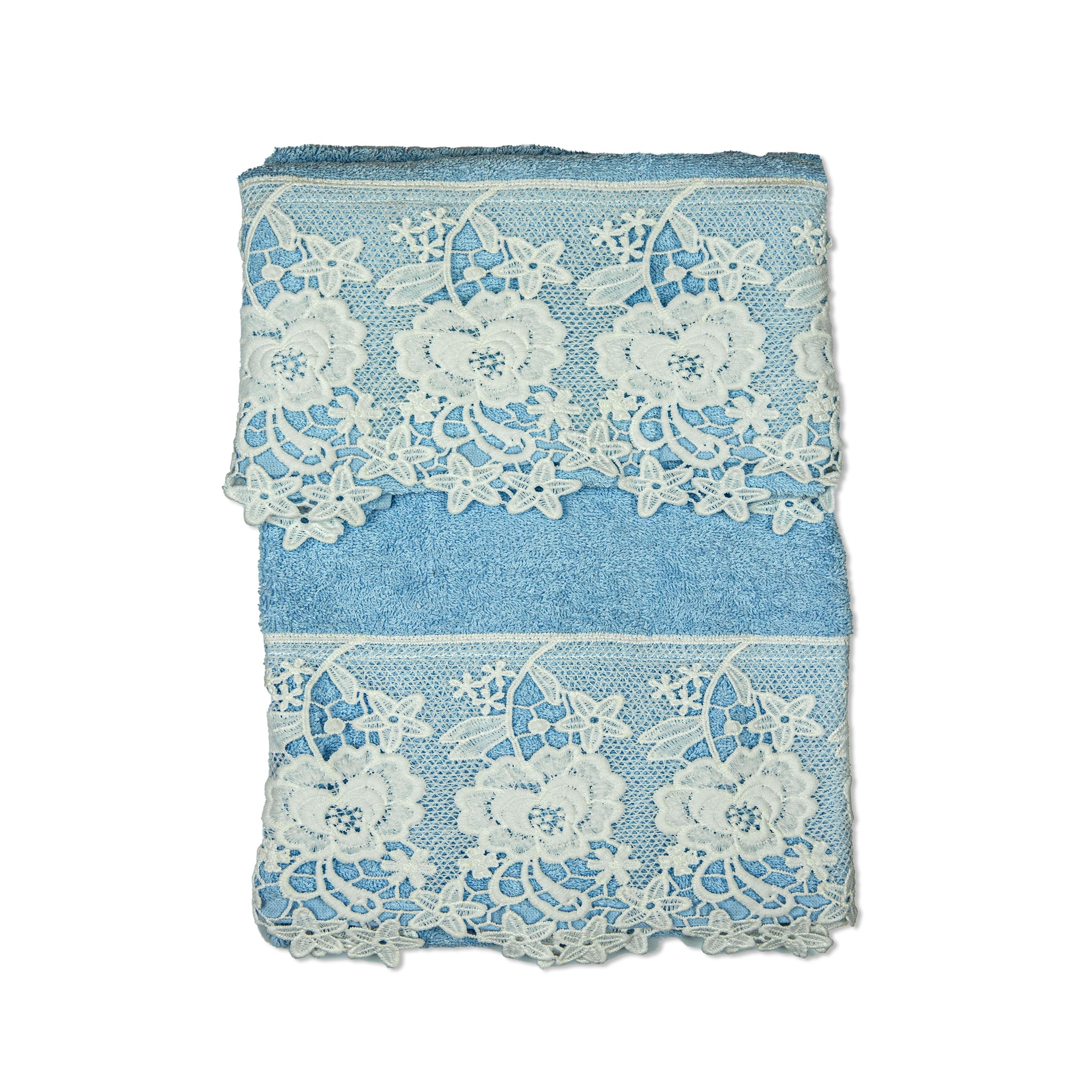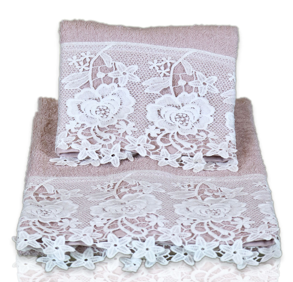 L'asciugamano grande misura cm 60 × 110, l'asciugamano piccolo misura cm 40 × 60. La balza in pizzo è alta cm 17.