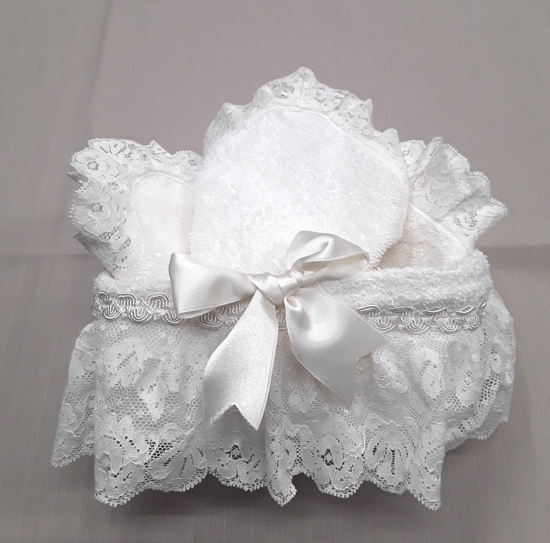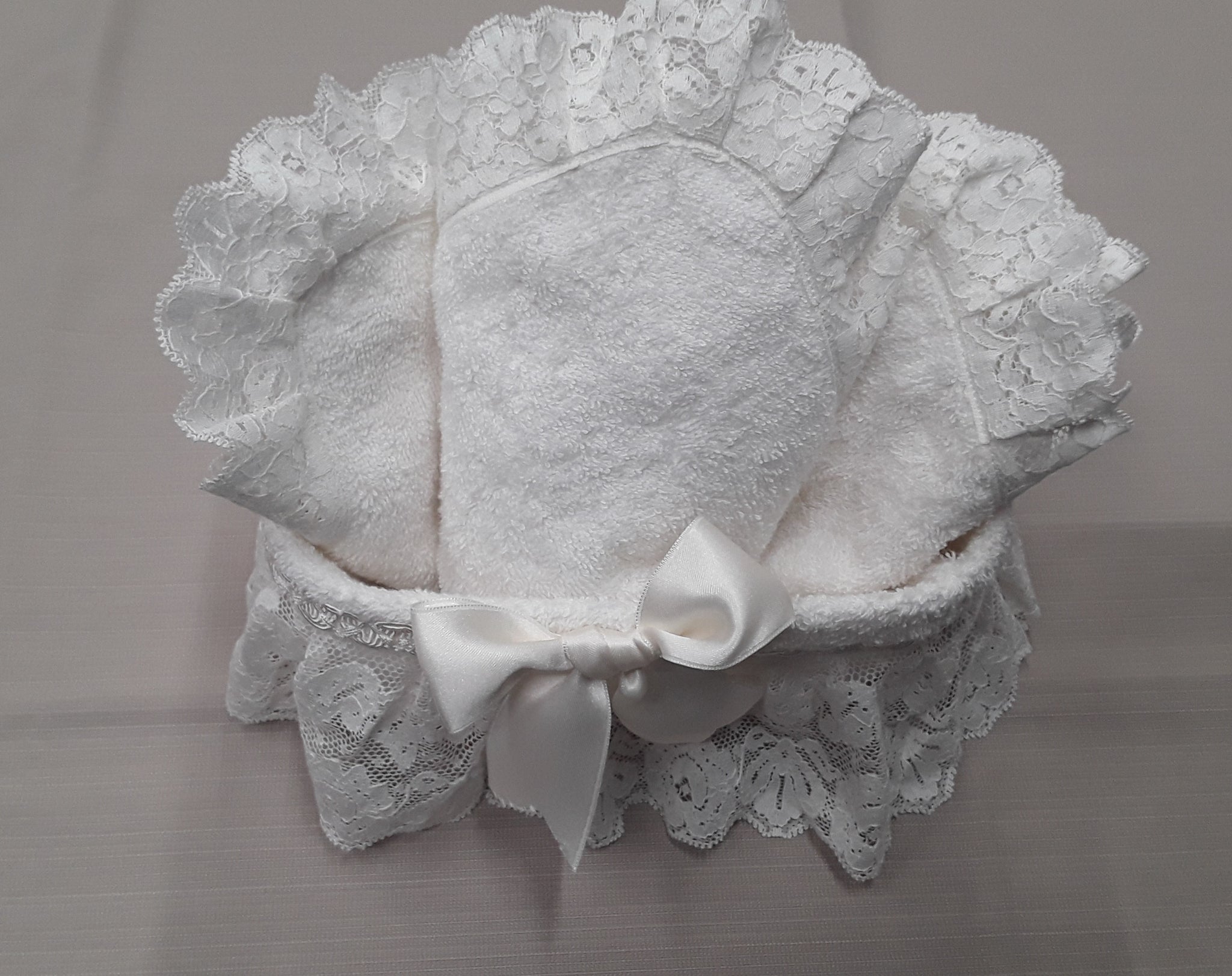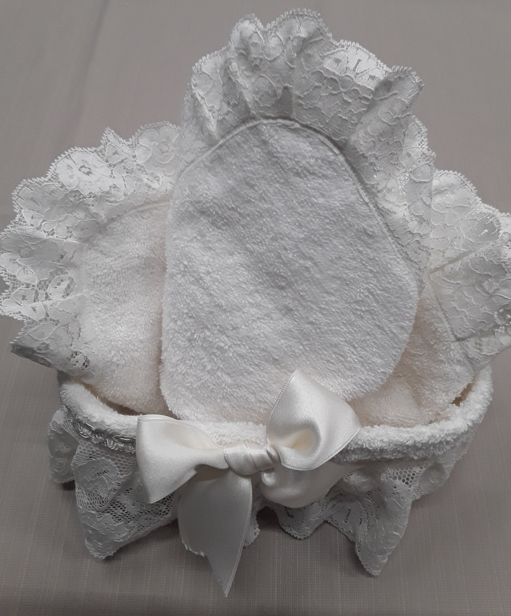 La serie PIZZO e' realizzata in spugna PANNA con alta balza in pizzo color PANNA (in puro cotone) molto raffinato e dal gusto romantico, arricchito da un grande fiocco in raso panna removibile.